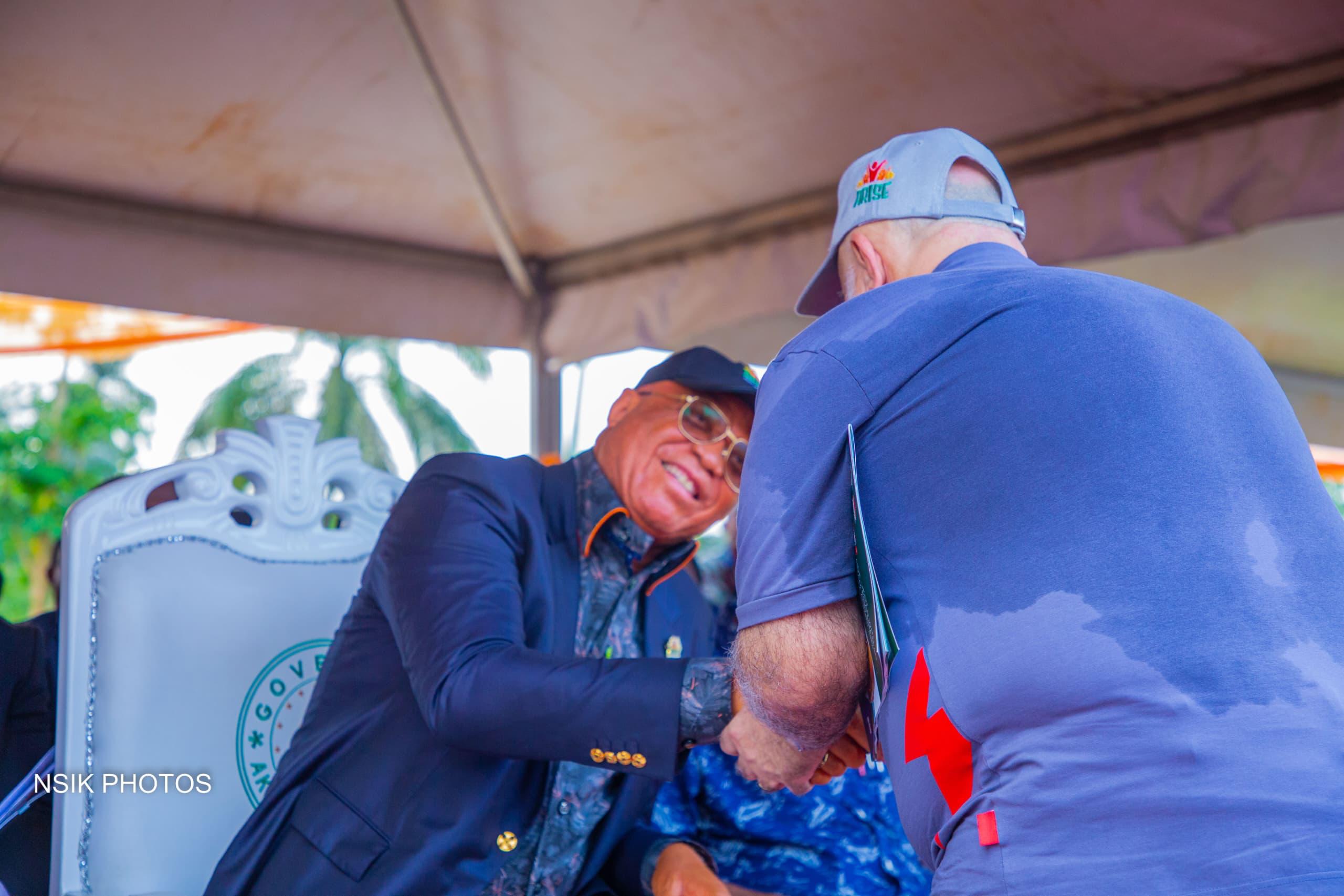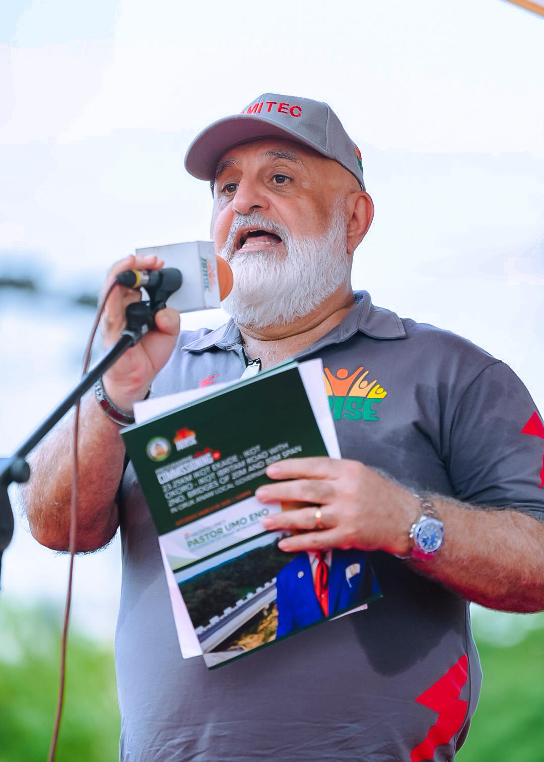 “This of the kind of thing we want to see. So, I am calling on other contractors to also sponsor students to the skills training institute. When they finish, you give them starter-packs to start up something on their own” Gov Eno Stressed. He however, directed the commissioner for education to ensure that 25,000 copies of those exercise books are distributed to schools in Oruk Anam while the other 25,000 can be shared to other schools across the state. Speaking on the road project, Pastor Eno who was also full of praises to Amitec for quality delivery, expressed satisfaction that a project inherited from his predecessor at 50 percent has been completed. He promised to complete all other economically- viable inherited projects across the state while directing that solar street lights be fixed on the whole stretch of the 23km road. Speaking earlier, the Managing Director of Amitec, Chief Aiman Saimua who was grateful to Governor Eno for his developmental strides and passion for rural development, said the company’s donation was simply to complement the Government’s visible effort in making life better for the citizens. His speech reads in parts: